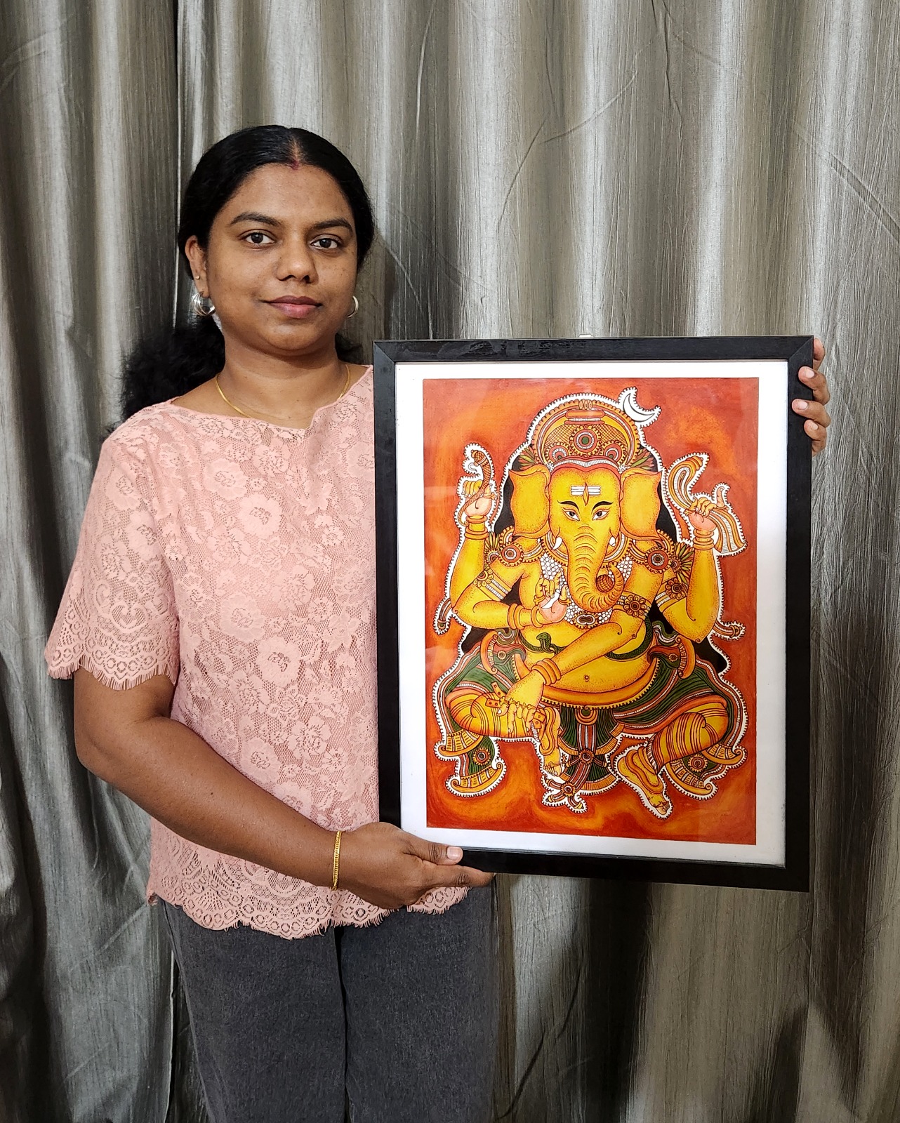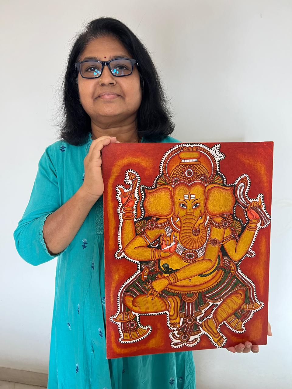 Gopika balanced her professional career while learning mural painting. Through structured lessons and guided practice, she developed confident detailing skills and completed this vibrant Ganesha artwork with improved color harmony and composition control.